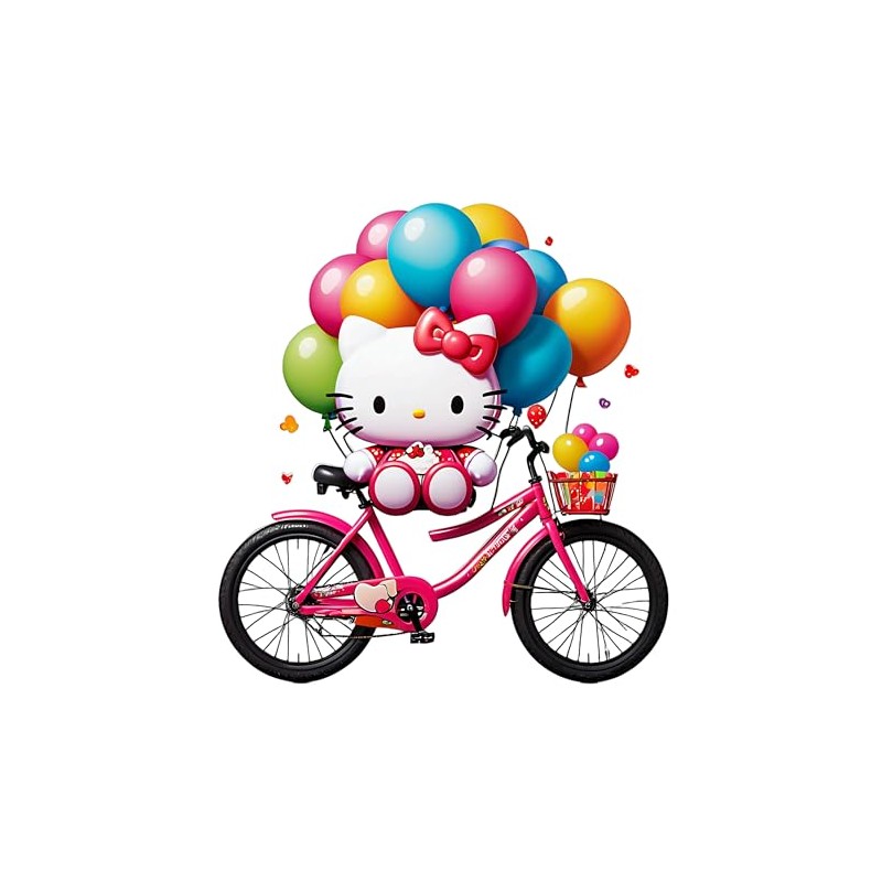 - DESIGN: Vibrant Hello Cuetty themed decal sticker featuring a pink bicycle and colorful balloons, perfect for room decoration or personal accessories