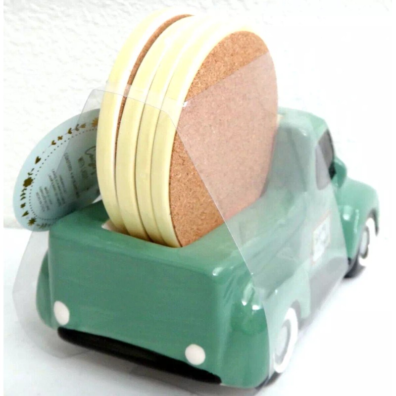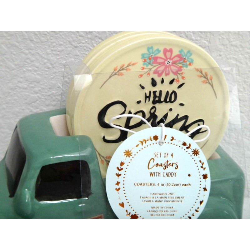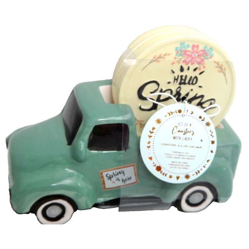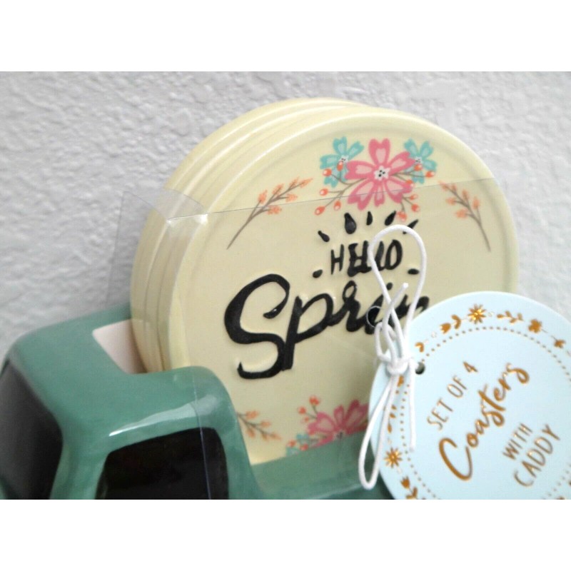Hello Spring 5-PC SET 4 Coasters & Ceramic Retro Car Caddy Teal Green Yellow