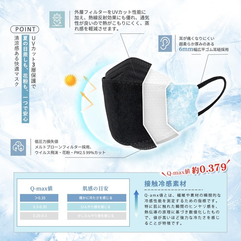 - 【ひんやり接触冷感】接触冷感素材で、マスク装着瞬間から持続的な涼感を実現。吸熱・放熱効果のあるマイクロカプセル配合で、炎天下や通勤時のムレを抑制します。通気性メッシュ構造が熱気を逃がしながら、敏感肌にも優しい滑らかな肌触りを維持。抗菌加工で夏の汗臭対策も万全な、高温多湿の日本夏に最適なクールマスクです。