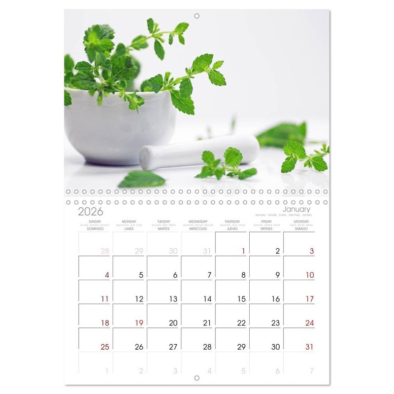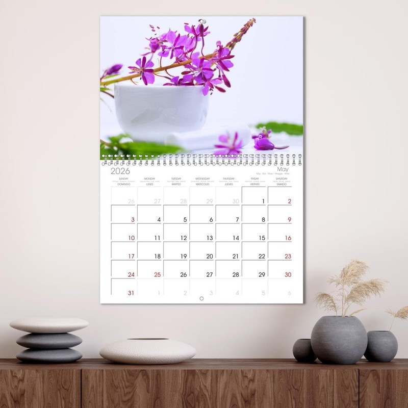 - 12 unique pictures, large monthly grid for planning with dates in 5 languages, including Spanish and French. 14 Month Calendar (Jan 2026 - Feb 2027).