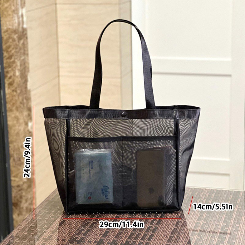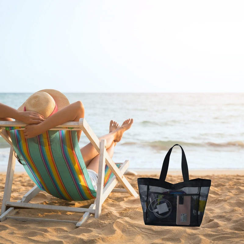 - Material: beach bag with press stud design, made of nylon mesh material. The mesh design provides better ventilation and visibility. The seams are tight and durable, perfect for the beach and outdoors.