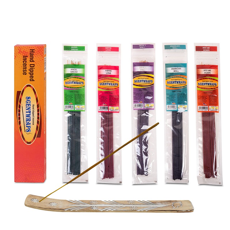 - PRODUCT: This Incense kit combo includes Hem ScentwrapsSet of 15 fragrances - Jamaican Roll, Angel Dream, Kiss me Again, Hippie Love, Devil's Spell, Millions On My Mind, Forest Fog, Berri-a-licious, Bikini Island, Blue Blast, Sexy Butt, Mango Power, Black Gem, Rose Beds, Naked Night&Raajsee Wooden Incense Holder.(Dimension 10x1.5 Inch).Each Pouch contains 12 sticks.(Total 180 sticks ), Length 11 inch. Each natural stick burns for 60-70 minutes (indoor environment)