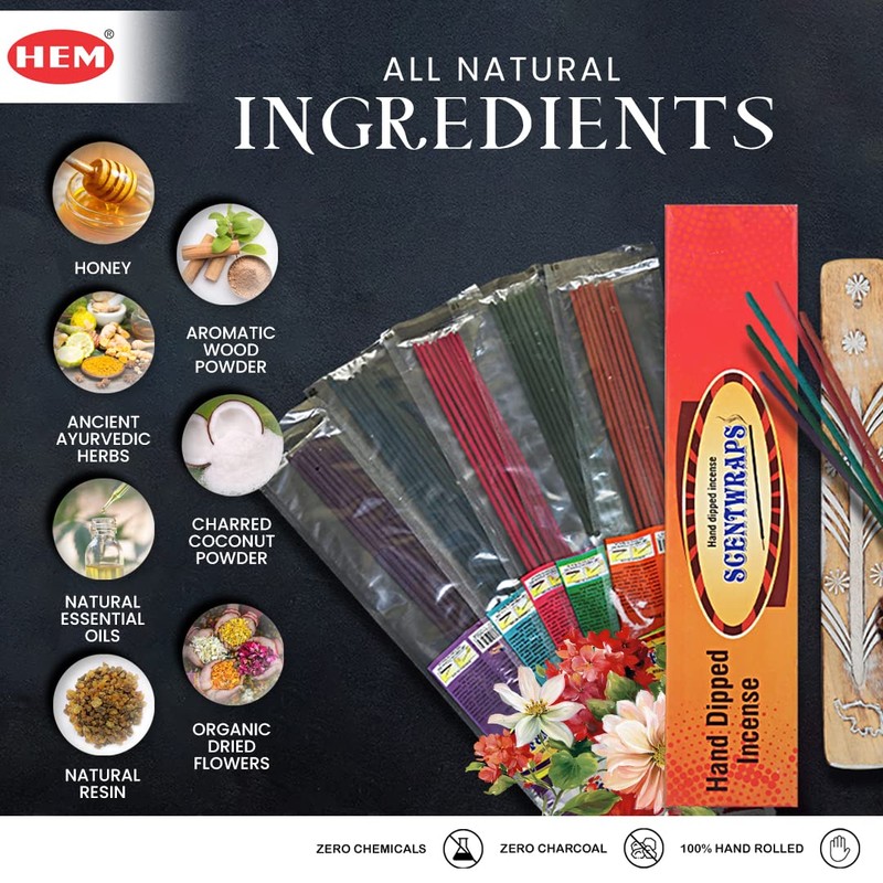 - NON-TOXIC CLEAN BURNING: : Hem Natural Insense sticks have been made using a unique blend of essential oils, the finest combination of Naturalingredients,herbs and natural wood powder to formulate a beautifully enhanced aroma throw. Our Incense fill the air with natural goodness and natural scents,Release the best fragrances that are entirely free from toxins, artificial scents and harmful residues.