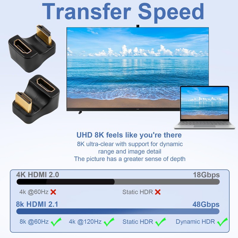 - Image quality - The HDMI 180 degree adapter (male to female) is fully compatible with the HDMI 2.1 standard and supports the resolution 8K@60HZ/4K@120HZ/2K@240HZ, 3D, static/dynamic HDR, VRR, ALLM. Perfect for gamers and home theater enthusiasts who want to unleash the full potential of modern displays