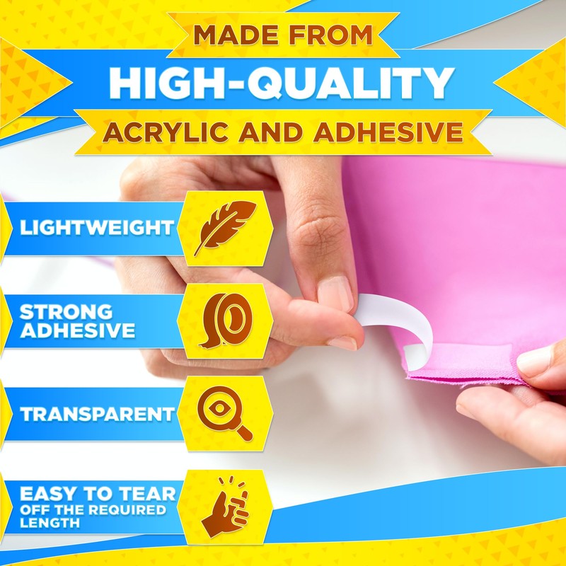 - 🧵 Strong Hemming Tape for Clothes: This clothes tape double sided provides a secure, long-lasting bond without sewing or ironing. Made of clear acrylic, it's ultra-thin and stays hidden beneath fabric
