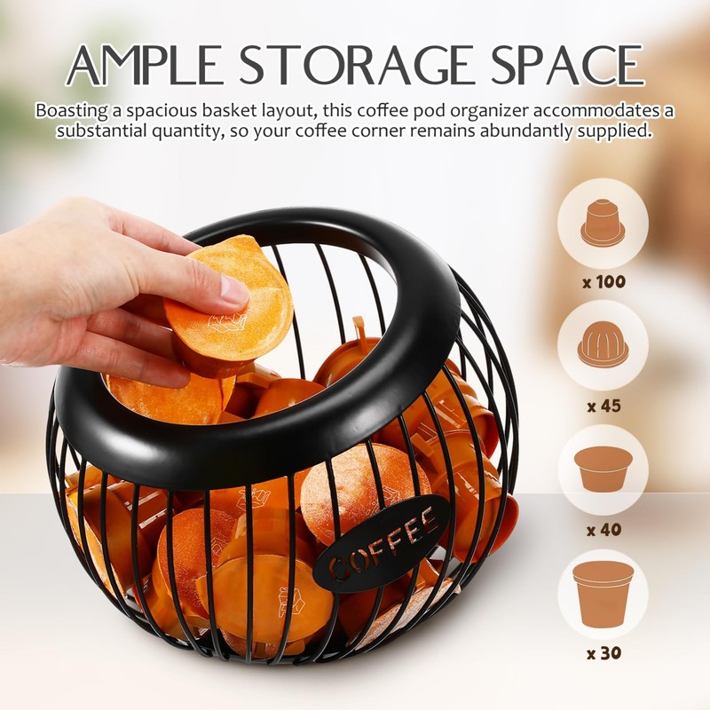 Keep your kitchen tidy and stylish with our black pod holder—the storage for , , and other coffee capsules. Its spacious 21x21x17.5cm /8.25X8.25X6.88in design holds multiple upright for quick access, saving you time during busy mornings. Made from iron wire, this sturdy organizer resists stains and bending, ensuring long-lasting use. The open wire design provides visibility while adding an industrial- to your countertop. , it doubles as a fruit basket, tea bag holder, or kitchen organizer—versatile for any home. Simplify your routine with this must-have coffee accessory!