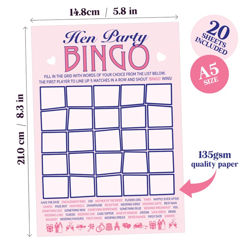 - How to play: Before your guests arrive cut the A5 Calling Card Grid into the 36 available words and place in a hat. Have every guest complete their bingo sheet using the A4 Word grid. Draw the words out of a hat and have each guest cross their words off as they come out. First guest to complete a full row of 5 wins (diagonals count!).