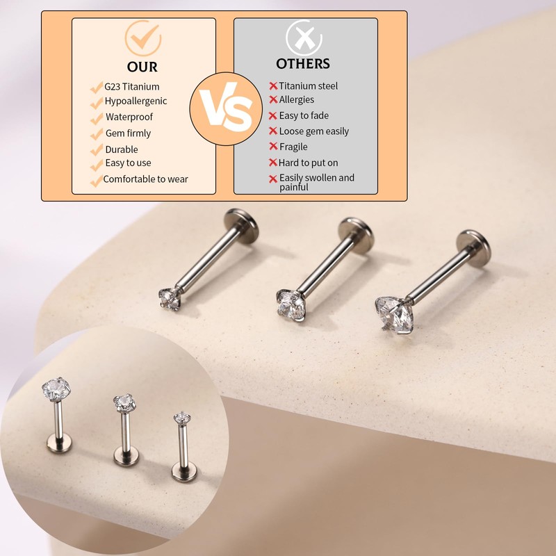 hengkaixuan G23 Titanium Labret Stud Earrings Lip Piercings Cartilage Earrings Helix Stud Earrings with Internal Thread Monroe Medusa Ring 18G 16G Tragus Conch Stud Earrings with CZ for Women Men 3
