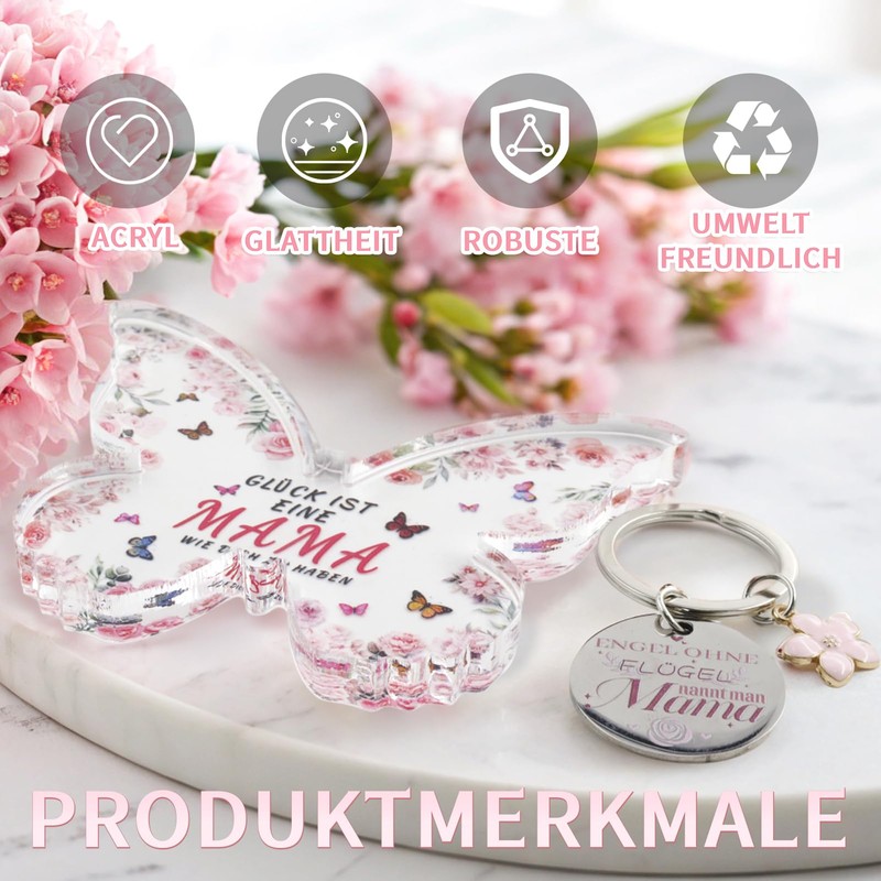 - Unique design: the saying "Glück ist, eine Mutter wie dich zu haben" printed on the mum acrylic plaque as well as the lettering on the keyring "Engel ohne Flügel nennt man Mama" deeply express gratitude and love towards the mother. They are ideal to give as a gift on special holidays such as Mother's Day, birthday or Christmas and convey warmth and gratitude