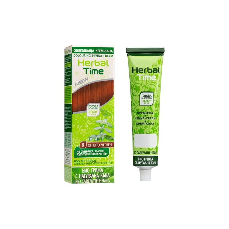 Henna Herbal Time Natural Cream Color Fire Red Nº 8 | Henna Coloring Cream with Nettle Extract | Gray Hair Cover | Ammonia Free, Sulfates Free, Parabens Free | 75 ml