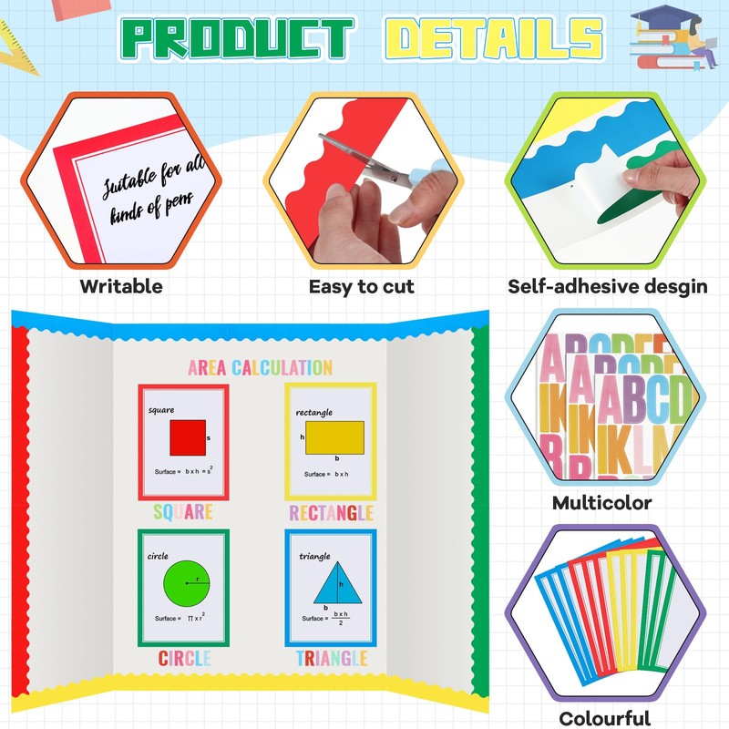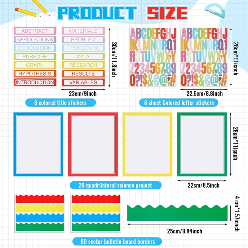 - Numerous Stickers: you will get 20 printable quadrilateral science project stickers, 80 scalloped bulletin board borders, 8 letter stickers, and 8 title stickers for your big class project or presentation, plentiful options for various projects and presentations
