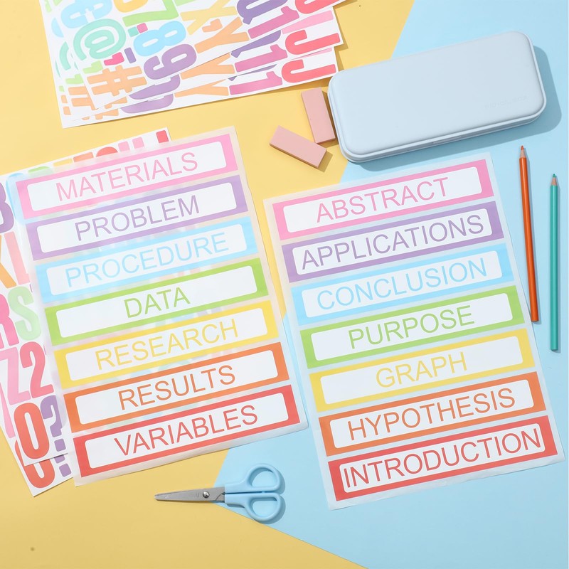 - Letter and Title Stickers: our 11 x 8.8 inch poster board letters stickers and 11.8 x 9 inch title stickers are designed to make your project titles more exciting; There are 8 pieces of letter stickers and 8 pieces of title stickers, use these to add to your presentations and grab attention