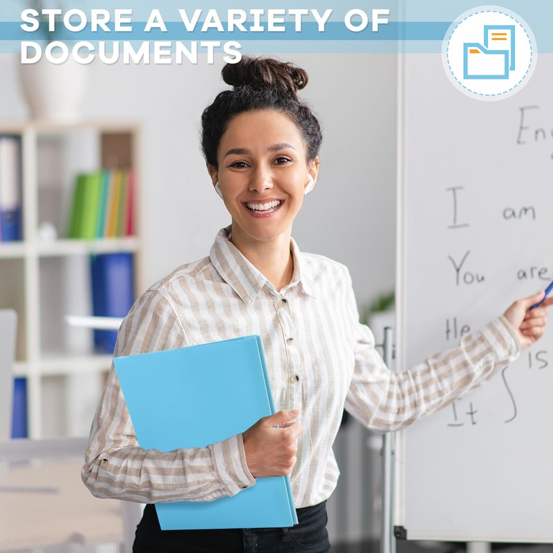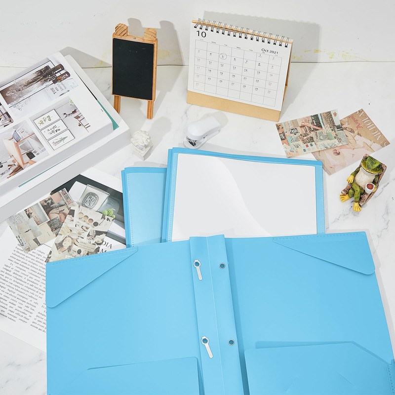 • Practical and Useful: with a light blue plastic folder, you can put your catalog, tables, reports, presentations and more for display; Each one has 2 internal pockets to help organize and store your letter sized paper and documents; There are also 3 prongs to secure your 3-hole loose leaf paper in case it falls, and the card slot can hold your ID card or business card, practical for your daily work
