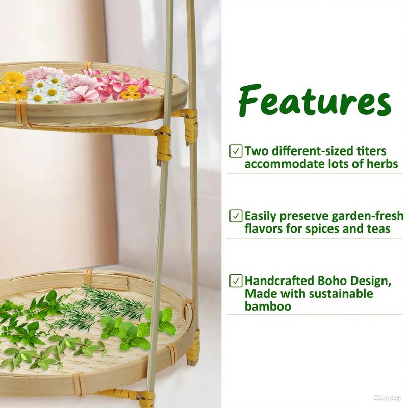 - Natural and Sustainable Design - Eco-friendly and sustainable, this Bamboo Herb Drying Rack is perfect for drying herbs, flowers, and leaves. Its two-tier design ensures proper airflow, preserving flavors and fragrances. The herb drying rack small countertop is ideal for drying tea leaves, spices, or herbs. The sturdy herb drying rack stand provides stability, while the herb drying rack tray bamboo offers durability. This bamboo herb drying rack is both practical and stylish, adding a natural touch to your kitchen or herb garden.