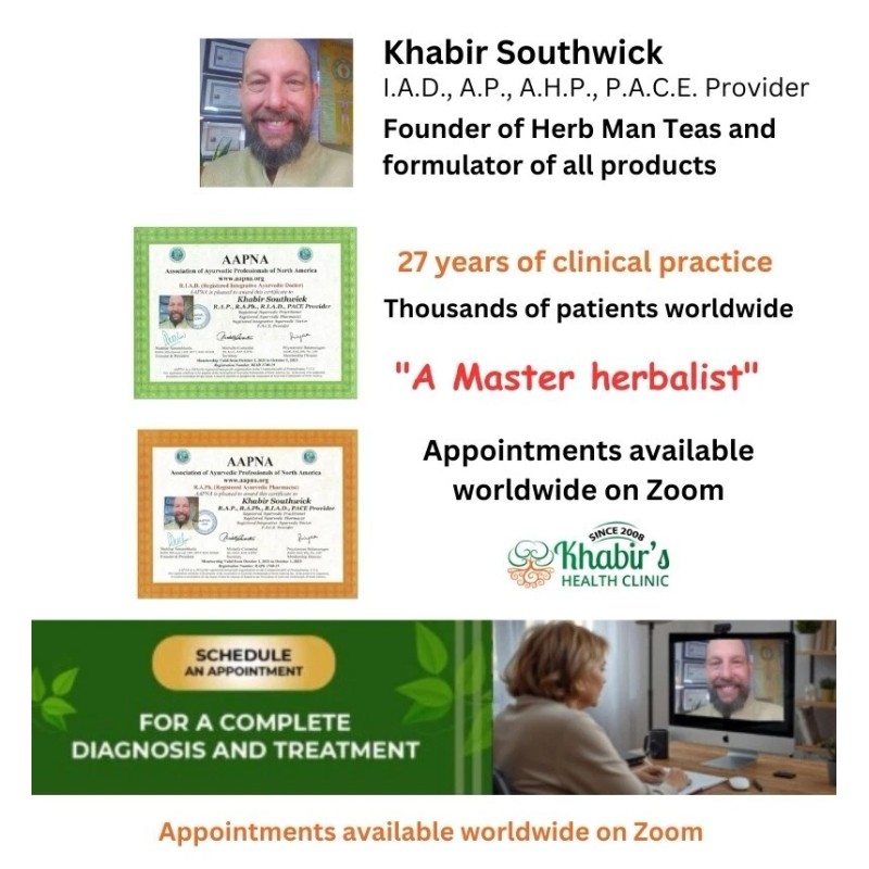 For years, this product has been a trusted solution in the clinics of Khabir Southwick, aka HerbMan, a highly respected Registered Herbal Pharmacist and Ayurvedic Doctor. If you're dealing with advanced or complex health conditions, this tea is designed to offer targeted relief. However, for personalized guidance, a Zoom consultation with Khabir is highly recommended.