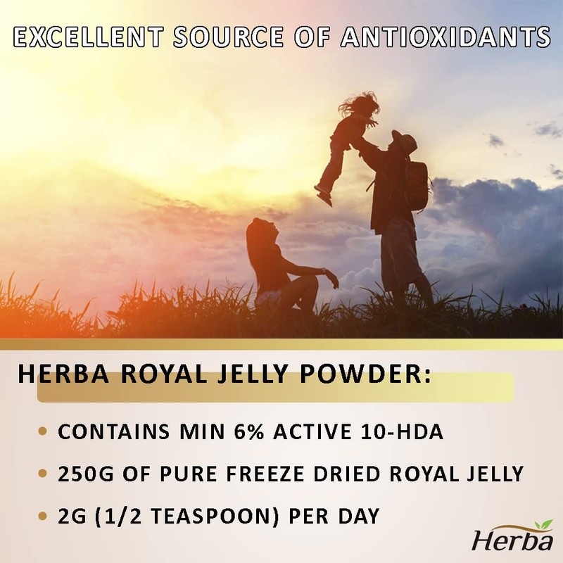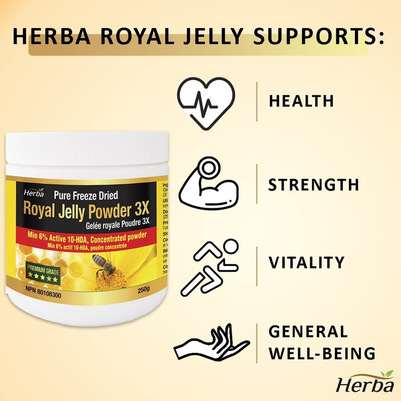 Herba Royal Jelly Powder 250g – 3x Concentrate | 100% Pure Freeze Dried Premium Royal Jelly Powder with Active 10-HDA | Source of Antioxidants | Product of Canada