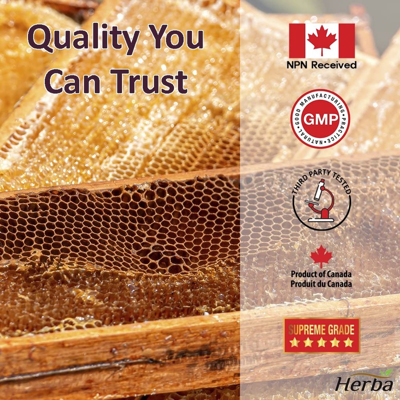 - Quality – Our royal jelly supplements are manufactured in a cGMP facility, third-party tested for quality and safety, and received NPN from Health Canada.