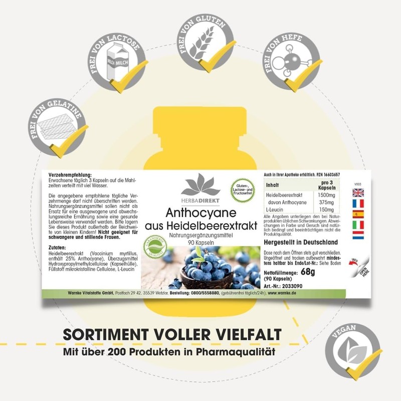 • Excellent value for money for German quality – Herbadirekt – anthocyane from blueberry extract 25%