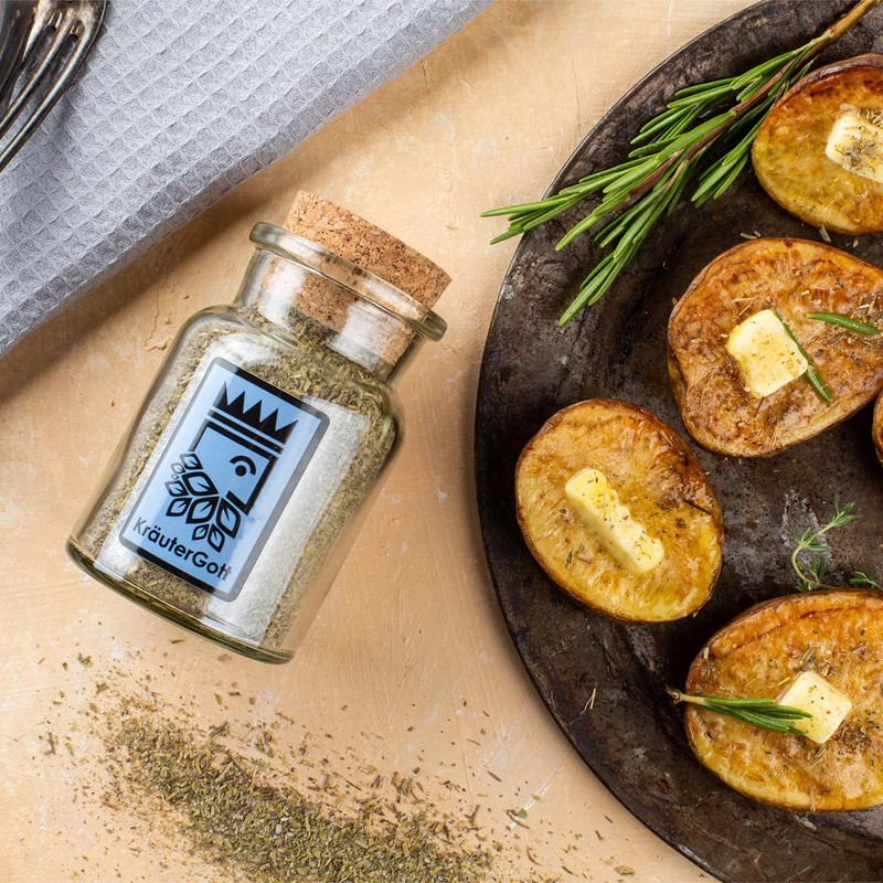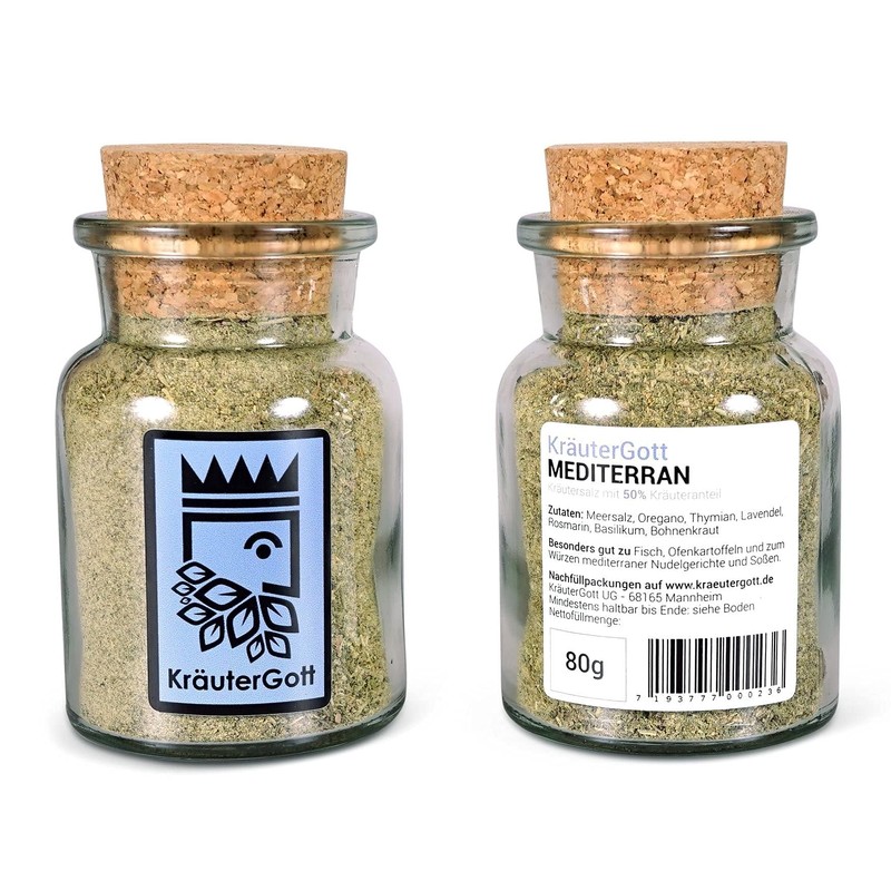 Herbal Salt Mediterranean with 50% Herbal Content - Original and Handmade by KräuterGott - 70 g in Elegant Cork Glass