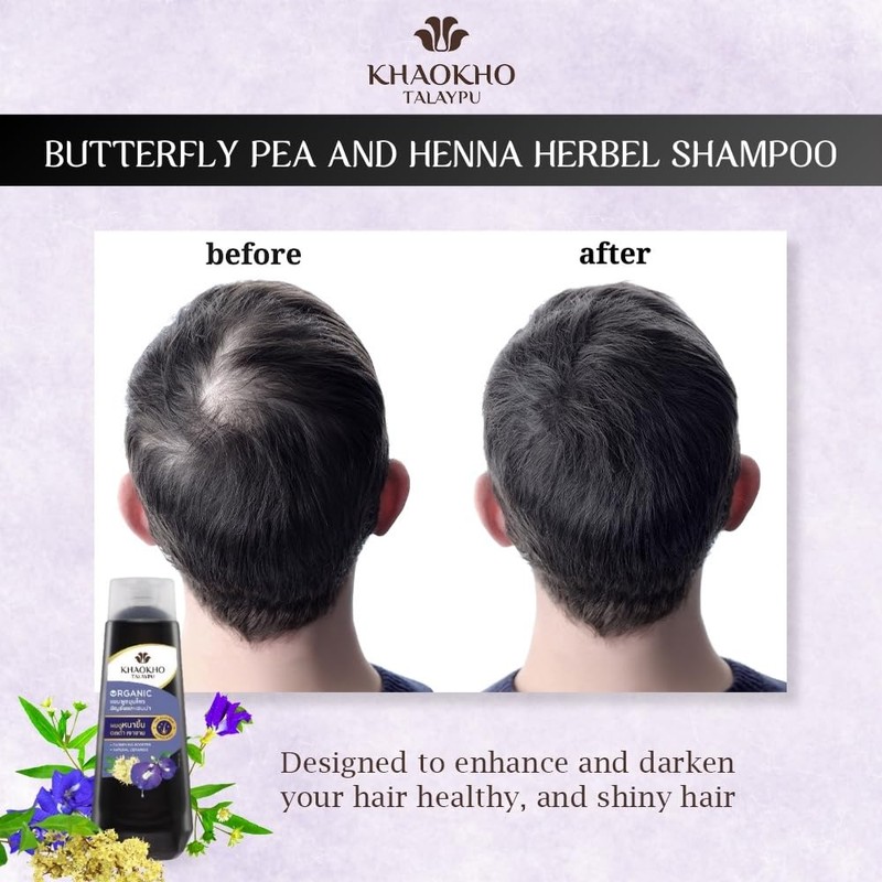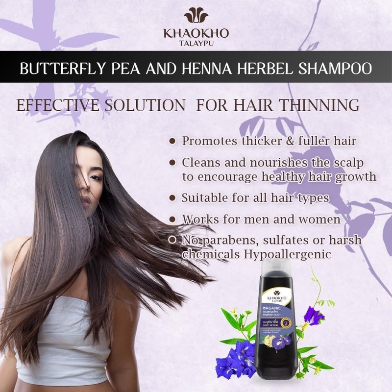 Khaokho Talaypu Herbal Shampoo with Butterfly Pea and Henna Extracts to Prevent Gray Hair and Strengthen Hair Roots, 185 ml (6.25 oz) 100% Natural product no harmful chemical.