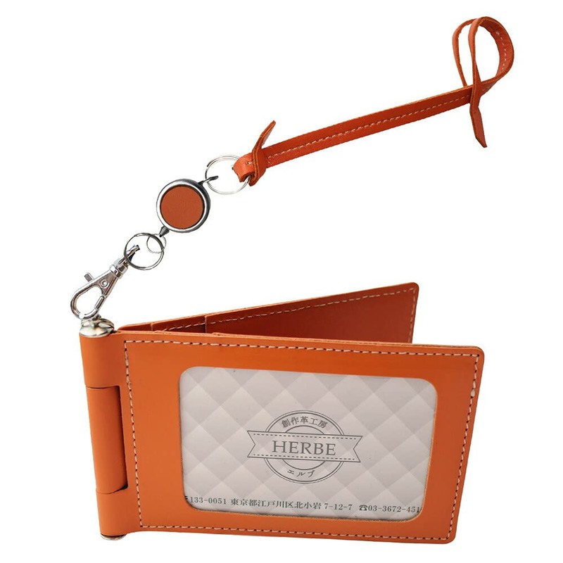 HERBE Pass Case, 4 Side Storage, Cowhide Leather Reel Strap, Rotatable, Made in Japan, orange