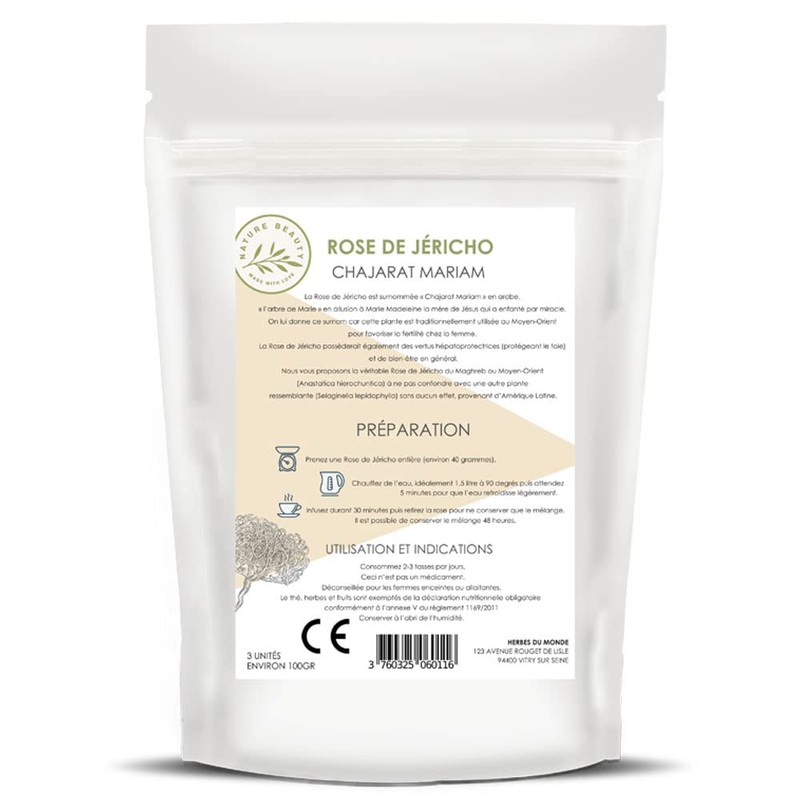 • Rose of Jericho - Anastatica Hierochuntica (Chajarat Mariam) - Herbes du Monde Discover the real rose of Jericho, Anastatica hierochuntica, also known as 'Chajarat Mariam' or 'Mary tree', an emblematic plant of the Middle East, known for its traditional virtues in terms of female fertility and liver protection. . Key Features Authentic Origin Our Rose of Jericho is the real species from the Maghreb and Middle East, Anastatica hierochuntica, known for its authentic properties, unlike the Selaginella lepidophylla from Latin America. Symbol of Fertility and Miracles Traditionally used to promote fertility in women, this plant is full of symbolism and history, associated with Mary Magdalene. Hepatoprotective properties: Known for its beneficial effects on the liver, the rose of Jericho supports general well-being thanks to its liver protective properties. BENEFITS PREMIUM QUALITY Carefully selected to ensure superior quality, our Jericho Rose offers optimal quality for maximum effectiveness. NATURAL & VIBRANT DECORATION Spectacular in its unfolding, it opens beautifully upon contact with water, creating a center of conversation and contemplation. Ecological Commitment Our rose of Jericho is produced with respect to nature, our commitment to environmentally friendly practices remains top priority. Why choose our rose from Jericho - Anastatica Hierochuntica? Choosing our rose from Jericho means choosing an authentic and high-quality product backed by a strong ecological commitment. It is ideal for those who want to integrate an element of tradition and nature into their habitat while benefiting from its unique properties for health and well-being. Experience the legend with our Rose of Jericho. Order now to enrich your space with this exceptional plant and enjoy its numerous benefits.