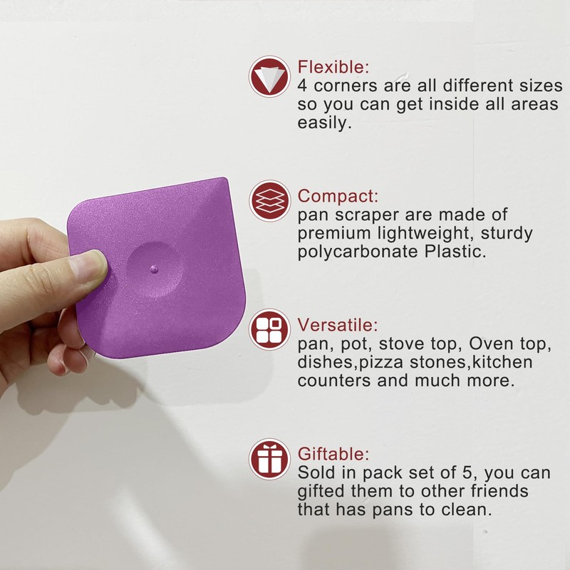 - ✔ Compact SIZE: Same size as other similar scrapers: 6cm x 6cm (2.36" x 2.36") .This pan pot scraper tool set are made of premium Nylon. Designed Lightweight, sturdy, does not bend with firm edges without scratching for nonstick pan.