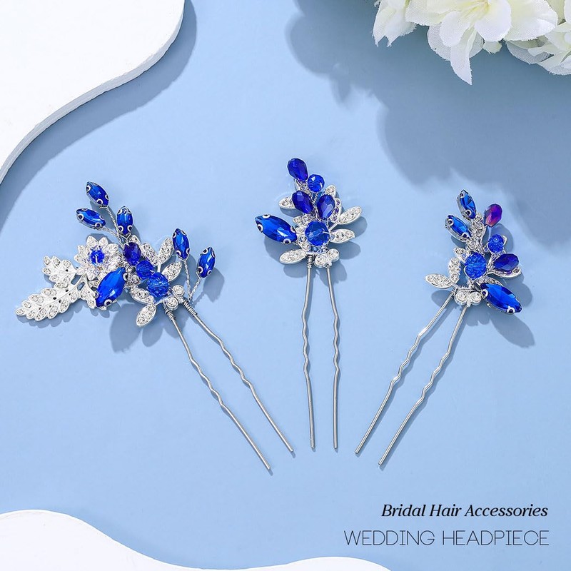Heread Blue Crystal Bride Wedding Hair Pins Silver Rhinestones Bridal Hair Pieces Leaf Hair Accessories for Women and Girls