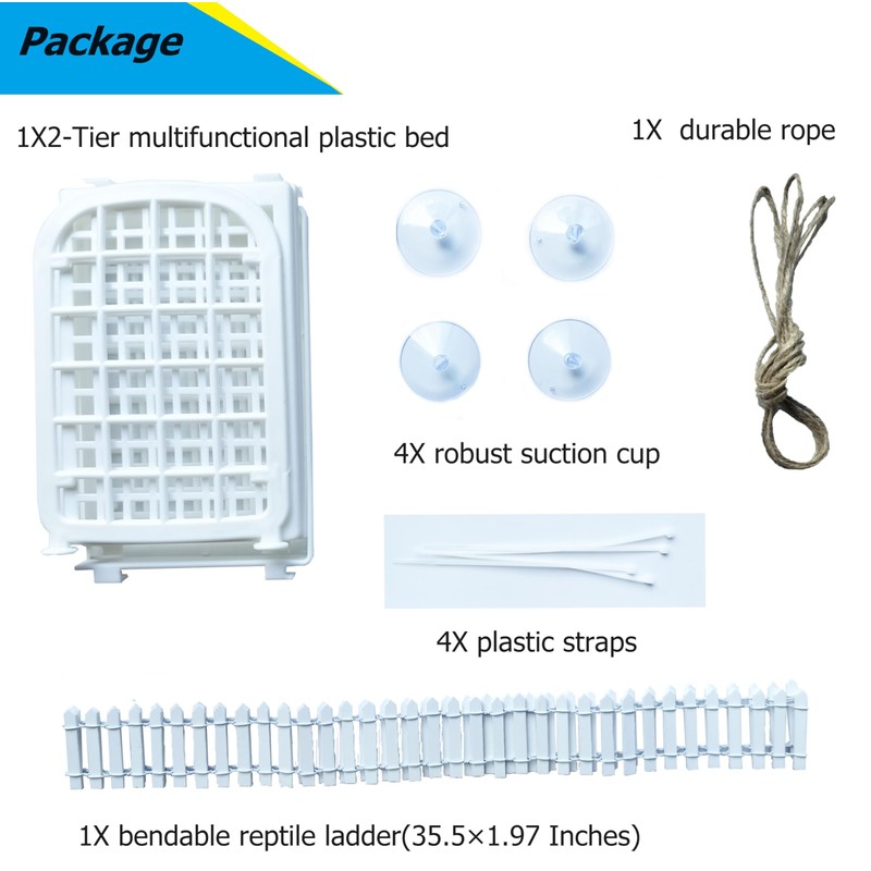 - ✔【Package】1X2-Tier multifunctional plastic bed(8.7 x 5.5 x 8in),1X bendable reptile ladder(35.5×1.97 Inches),4X plastic straps, 1X strong and durable rope,4X robust suction cup(diameter 5cm)