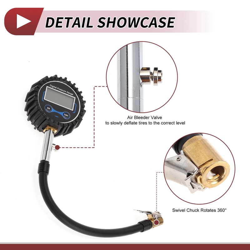 It is generally made of material and needs to be connected to the tire valve when in use. The value can be read through the digital display. It has higher accuracy and diverse designs, with comprehensive internal parts configuration and high working efficiency.