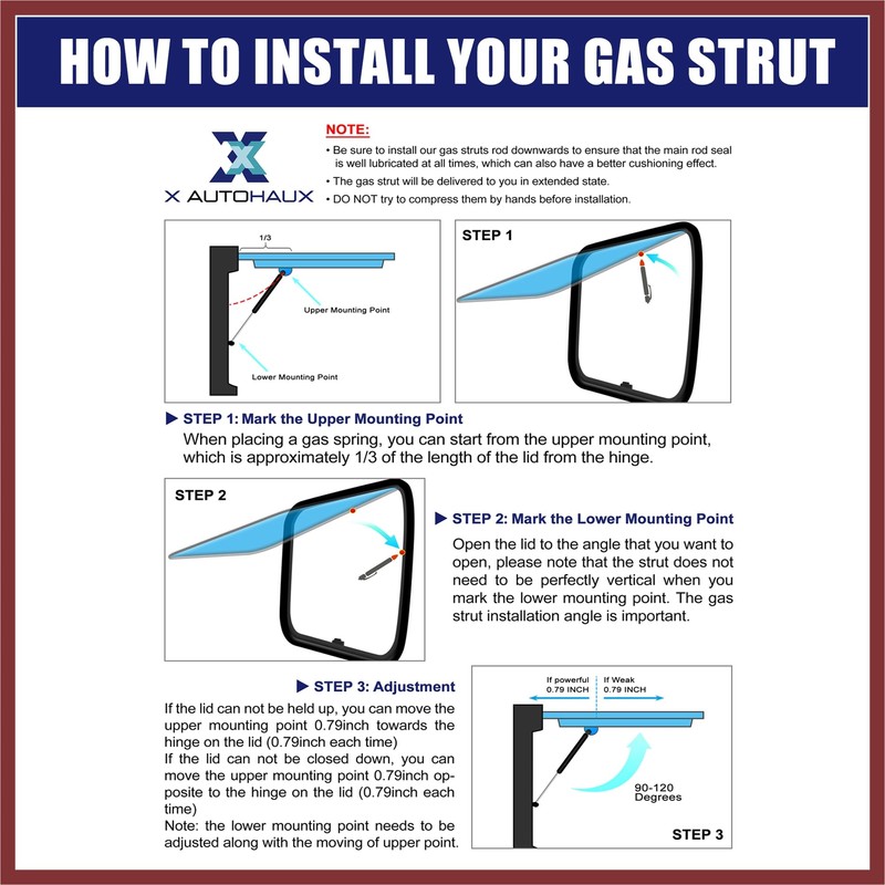 - Item: Easy to install, measure the distance for installation, fix mounting brackets, and then press on the new gas spring on the installation position.