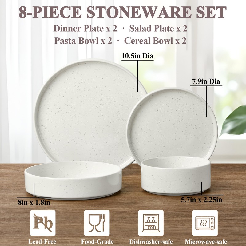 Herogo 8 Piece Dinnerware Sets with Pasta Bowls for 2, Dinner Salad Plates and Cereal Serving Bowls, Stoneware Dishes Dinner Ware for Kitchen Dining, Chip & Scratch Resistant Dishware, Speckled White