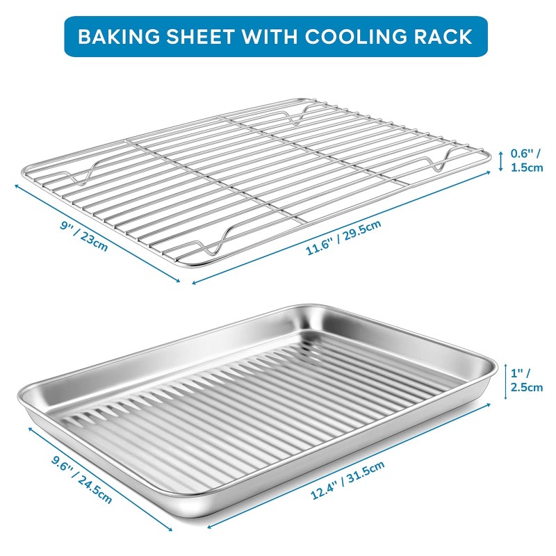Bakeware size, baking tray 12.4" x 9.6" x 1", cooling rack 11.6" x 9" x 0.6", this baking sheet set is perfect combo, work perfectly together and also can superbly apart. Smooth mirror finish, dishwasher safe and easy clean by hand wash