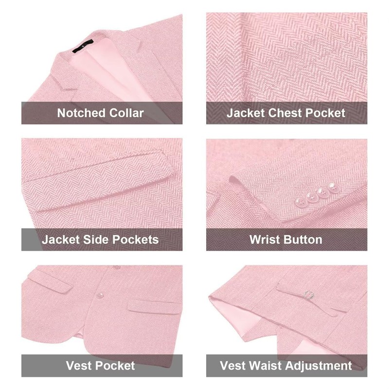 Herringbone Tweed 3 Piece Mens Suits Wool Blend Formal Party Dinner Tuxedo Set Business Suit Jacket Blazer Vest Pants for Men Pink XXL