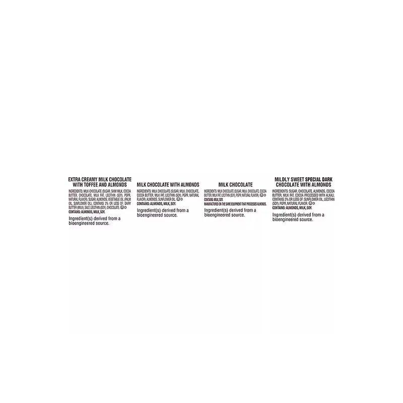 - Includes HERSHEY'S NUGGETS milk chocolate candy bars, milk chocolate with almonds candy bars, extra creamy milk chocolate with toffee and almonds candy bars and SPECIAL DARK mildly sweet chocolate with almonds candy bars