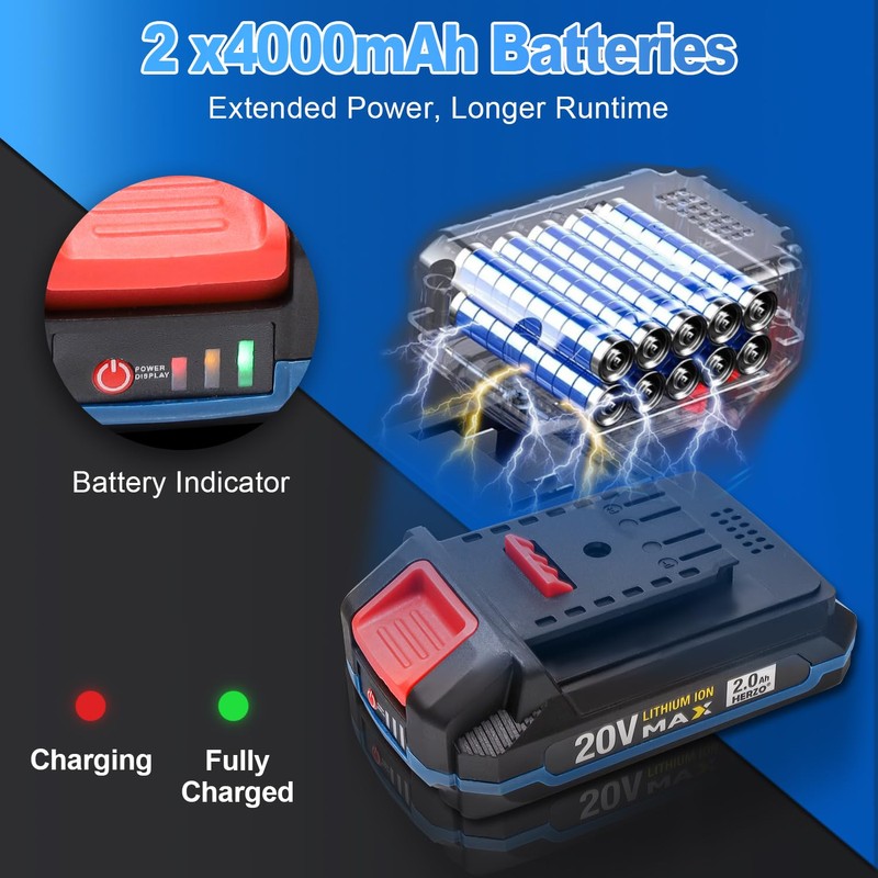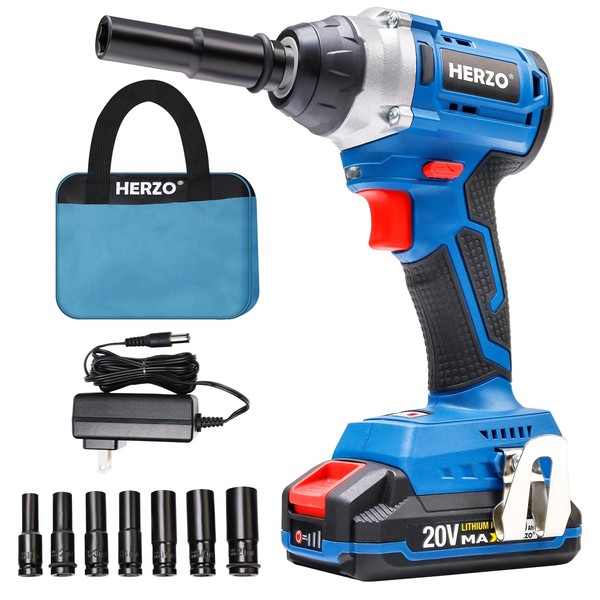 • 【Package Contents 】1 x HERZO Impact wrench (bare-tool), 1 x 2.0Ah Li ion battery, 1 x Metal clip, 7 x Impact sockets (10mm,12mm,13mm,14mm,17mm, 19mm, 21mm),1 x Fast charger,1 x storage tool bag.