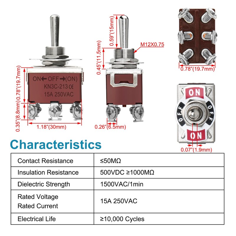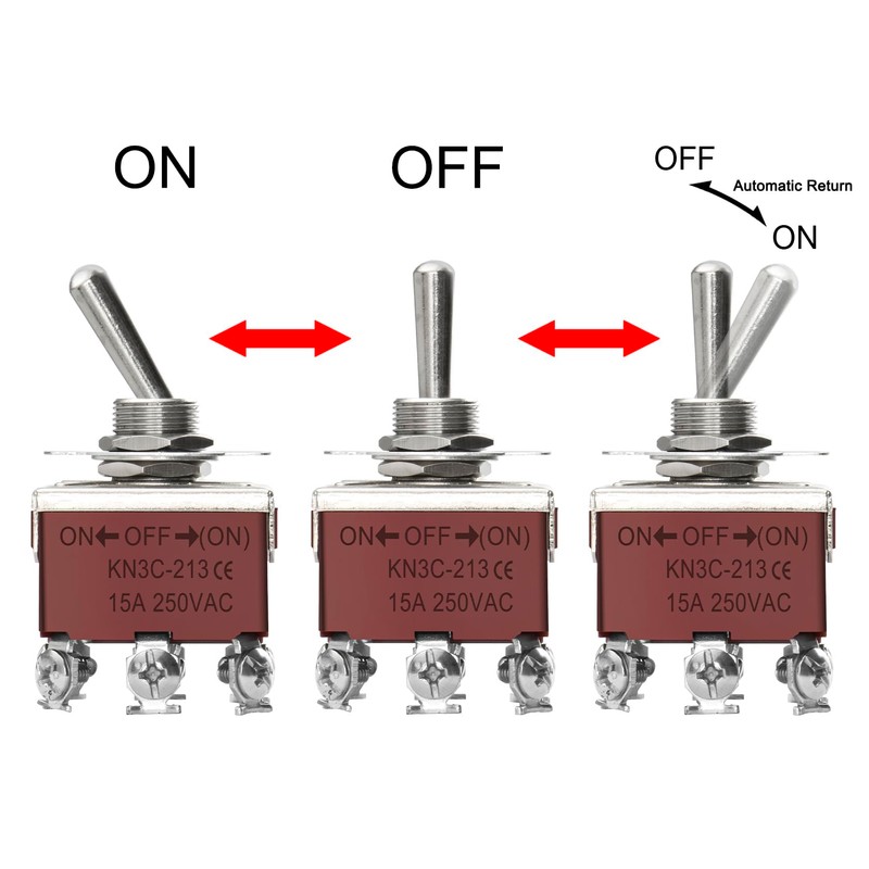 Heschen Metal Toggle Switch, KN3C-213 DPDT, ON/OFF/(ON) Side Momentary, 3 Position, 15A 250VAC, CE