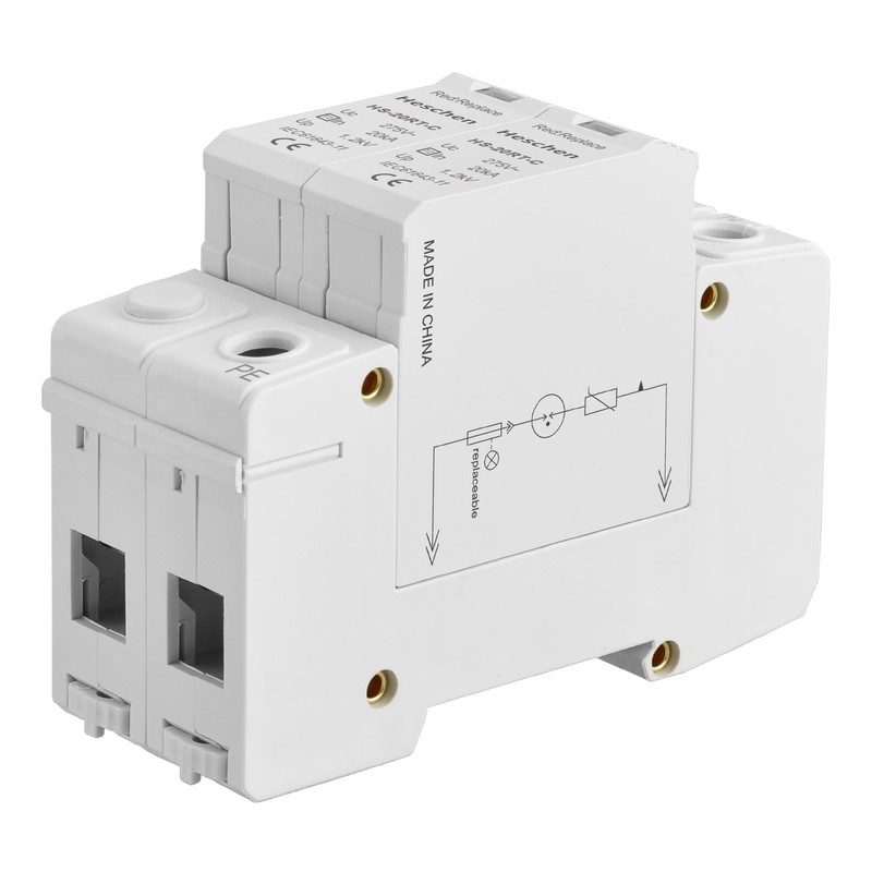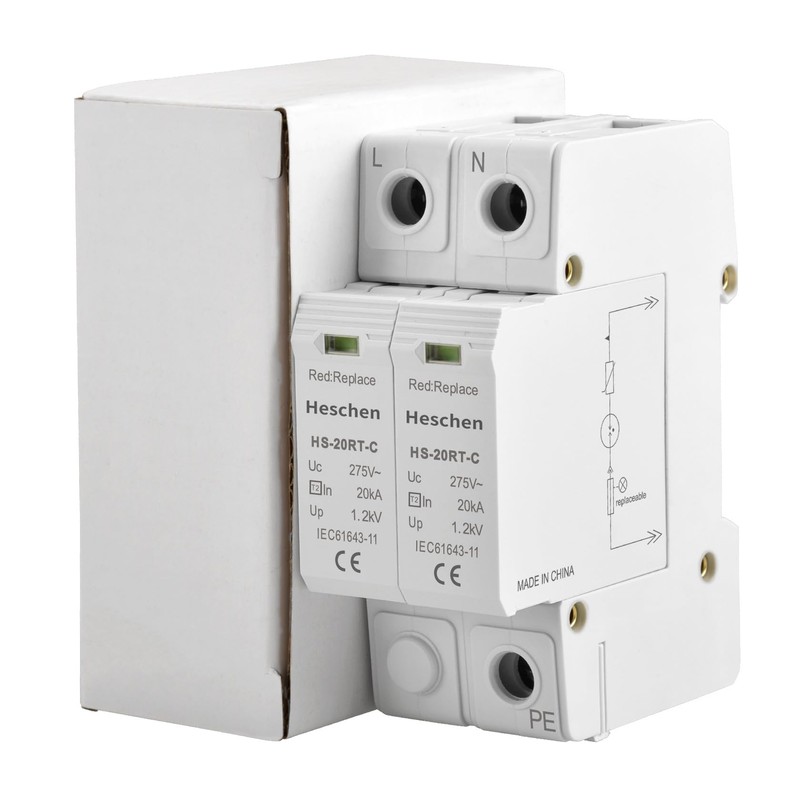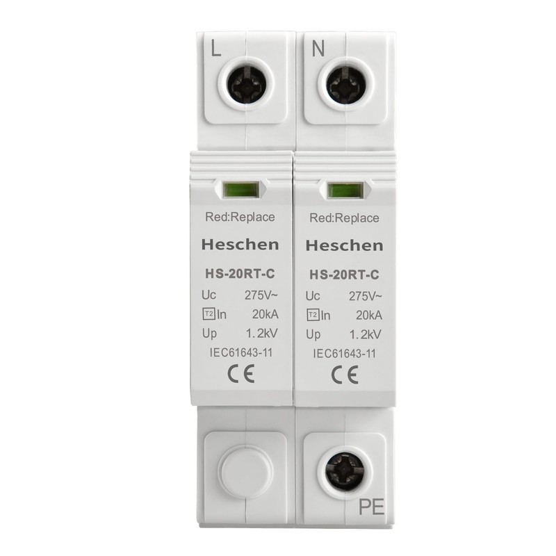 Heschen Surge Protector SPD, HS-20RT-C, 2P 275VAC 20KA, Integrated Replaceable Overcurrent Fuse, Fireproof, 35mm DIN Rail Mount