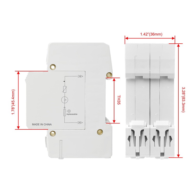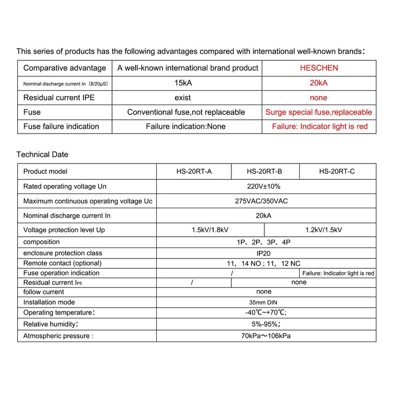 - Rated Discharge Current (In): 20kA; Maximum Discharge Current (Imax): 40KA
