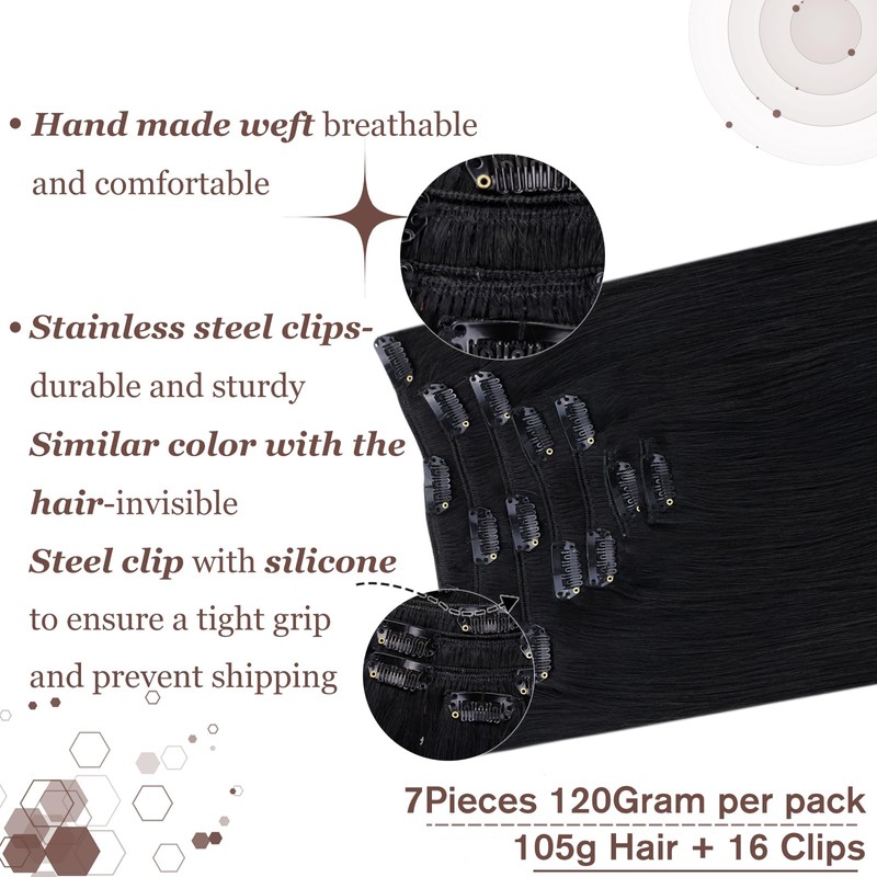 - Features of Hetto clip-in hair extensions: Clip hair extensions include 7 pieces with 16 clips: The 30.5 cm long extensions have a net weight of 80 g for hair with 20 g clips; 35.56 cm - 56 cm long extensions have a net weight of 100 grams for hair with 20 g clips. The clip is made of rust-proof material and uses the colour closest to the hair colour. No one will discover your secret