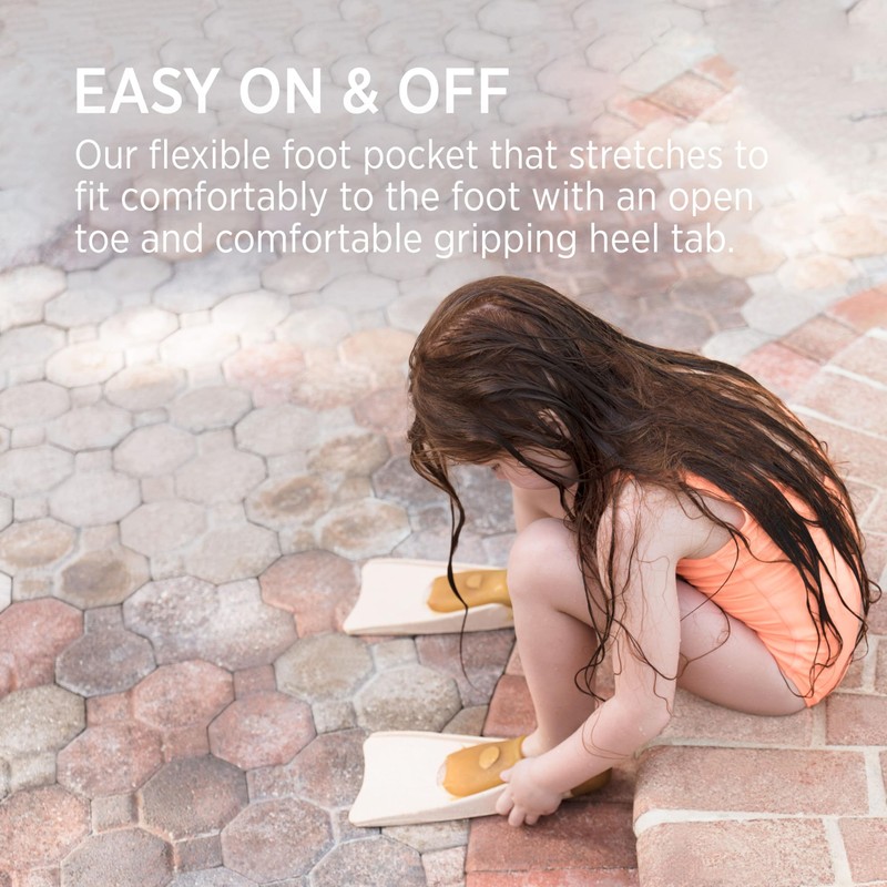 - COMFORTABLE & EASY PUT ON & TAKE OFF - Our Swim Fins have a flexible foot pocket that stretches to fit comfortably to the foot with an open toe and comfortable gripping heel tab