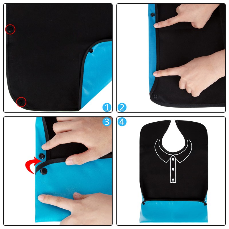 - EASY TO USE - The reusable bib for adults has poppers on the neck and bottom for easy on and off, and the bottom can form a pocket to catch dropped food effectively.