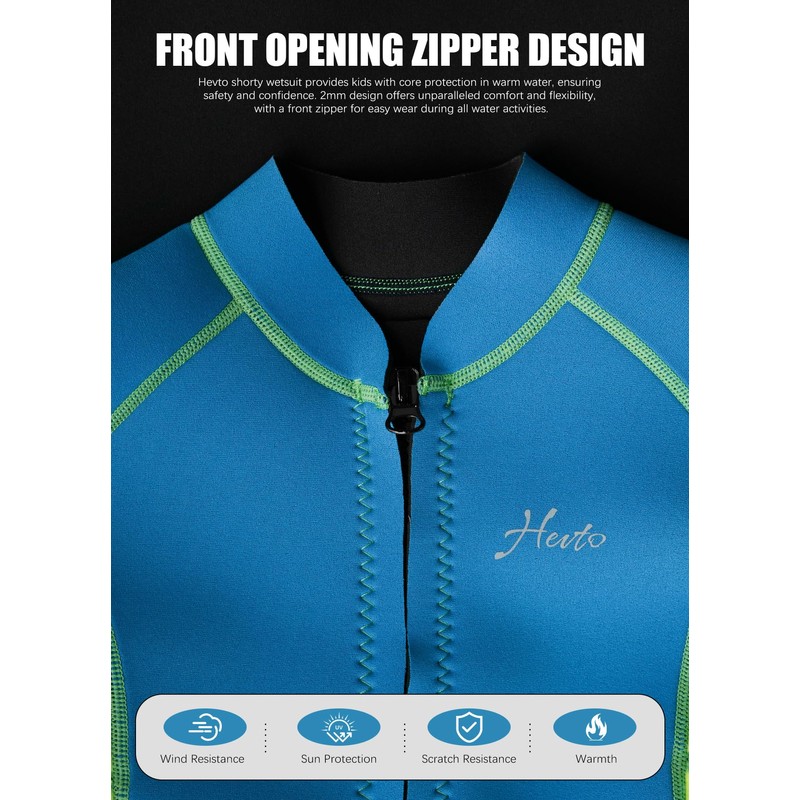 - Comfortable and Flexible Design: The Hevto kids wetsuit shorty is crafted from 2mm neoprene, offering a soft and comfortable fit that snugly conforms to your child's body without restricting their movements. The thoughtful front zipper design enhances flexibility, making it an essential piece of equipment for children engaged in various water sports.