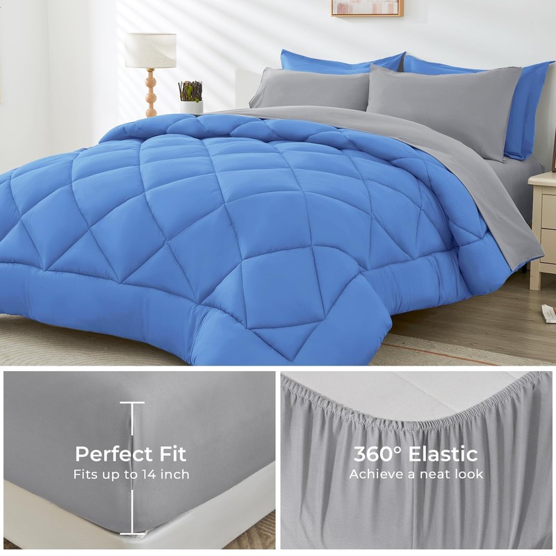 - Practical Details: The 360° elastic fitted sheet with a deep pocket fits most mattresses about 10"-14" deep. The baffle box construction of the comforter prevents the fiber fill from shifting, even after several times of wash