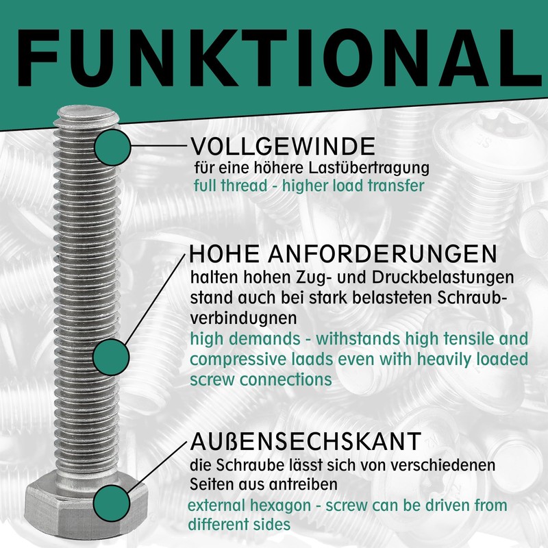 The metric fully threaded screws can be screwed into an existing internal thread. They can also attach or connect components with the help of washer and nut.