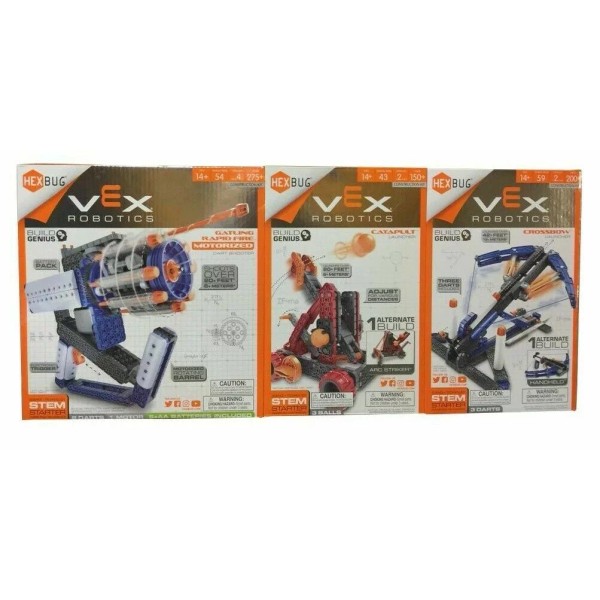 *SALES TAX NOW CHARGED ON ALL ORDERS* ITEM IS NEW IN OPEN & DISTRESSED PACKAGING! ITEM IS PERFECT! HexBUG Vex Robotics Launchers STEM Construction Kit Bundle, 3-pack - Charge in to victory with the Hexbug Vex Robotics Gatling Rapid Fire, Robotics Catapult & Crossbow Launcher. This hulking three pack is designed to flatten your opponents with three robot warriors ready to smash, strike and destroy.VEX Robotics Gatling Rapid Fire by Hexbug. The VEX Robotics Gatling Rapid Fire by Hexbug is an unrivaled motorized dart shooter! Unlike other similar hand-held dart blasters, kids can learn valuable engineering skills as they assemble the 275 plus components in this kit. It's perfect for kids aged 8 years and up, and includes a motorized spinning barrel that unleashes 8 rubber-tipped darts with rapid fire!VEX Robotics Launcher 3-Pack-Promotes STEM: Science, Technology, Engineering, Mathematics-Crossbow Launcher launches over 42 feet, shoots 3 darts at one time and has an alternate build. Ages 14 & Older, 200 Pieces, Difficulty 2. LOCATION: 78-GLASS3 33B J |