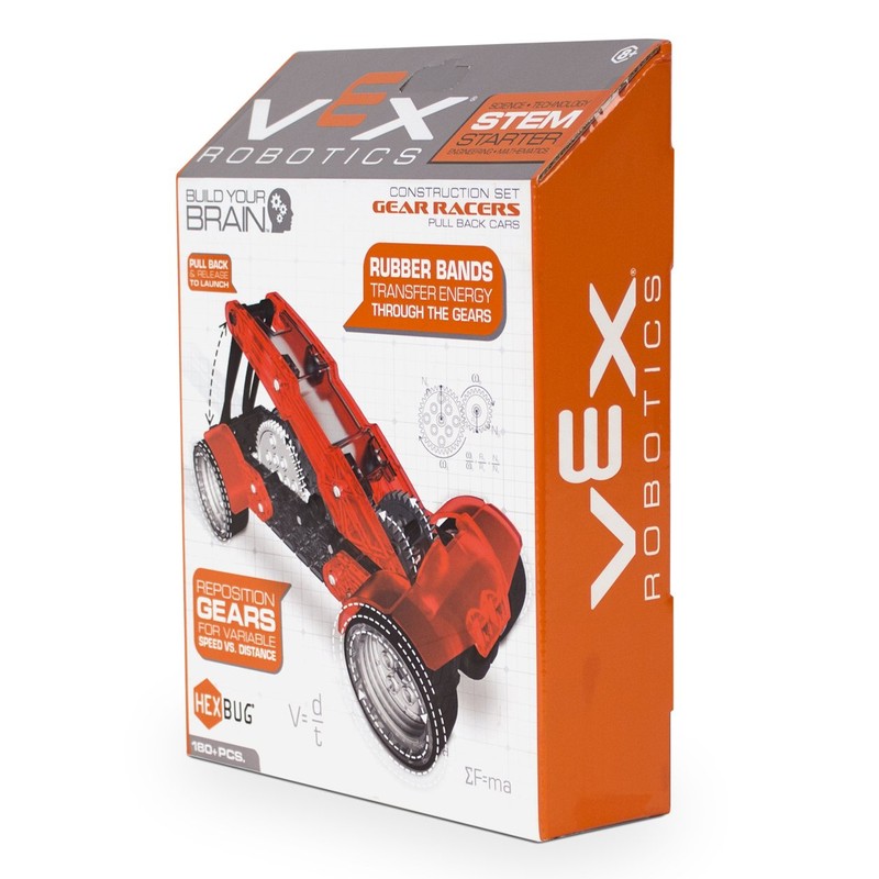 This construction kit challenges you to not only build Genius, but also build a pull back VEX robotics gear racer! the gear racer teaches you about how machines convert potential energy into kinetic energy, while the multiple gear ratios teach you about the fundamental principles behind speed and torque. Pull back and release the fun with the VEX robotics gear racer by HEXBUG.