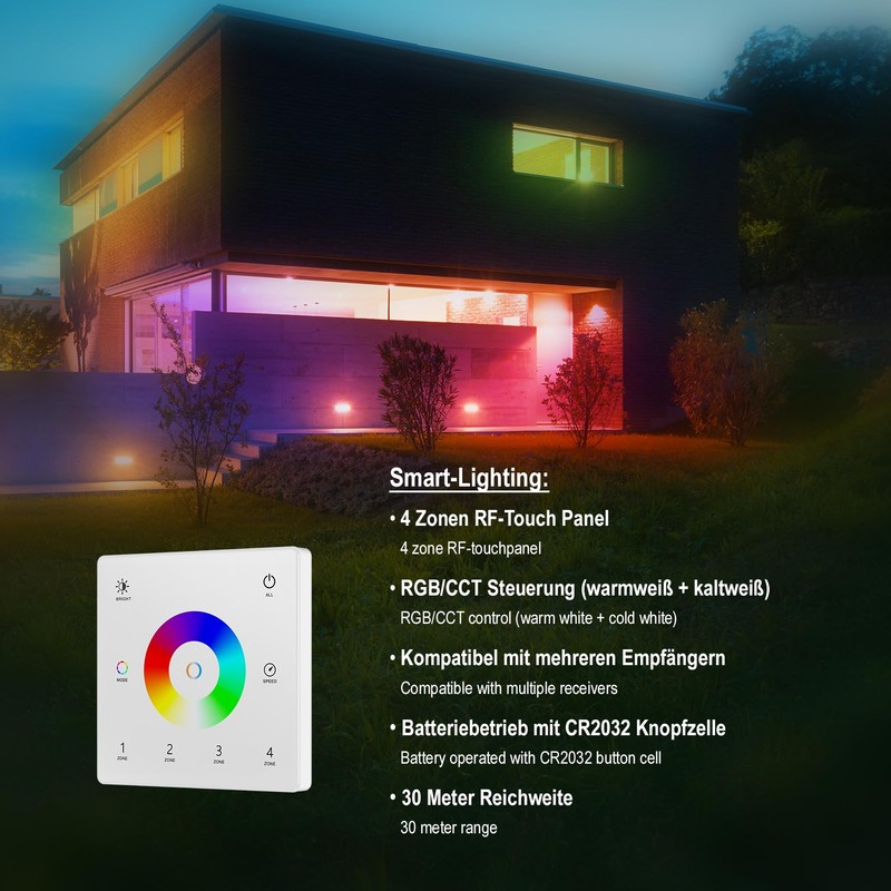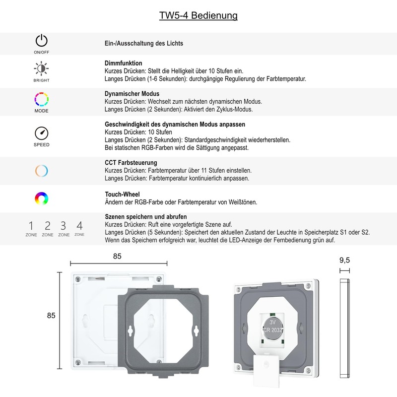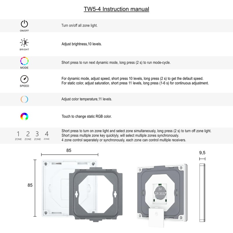 - Model: TW5-4 White - 4 Zone Touch Wall Switch for RGB, White & Dual White LED Lighting. Technical data: IP20, radio connection: RF 2.4 GHz - 20 m range, 3 V DC, CR2032 battery, dimensions: 85 x 85 mm, batteries are included