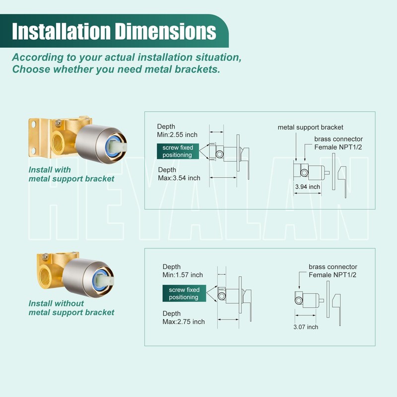 - 【install】: Shower mixer valve and trim kit with US standard female NPT 1/2 thread. Streamlining the installation process and saving time.The set does not include handheld shower or top spray, and needs to be used with additional handheld shower or shower head. It is a perfect replacement for single-function shower valves wall mount.