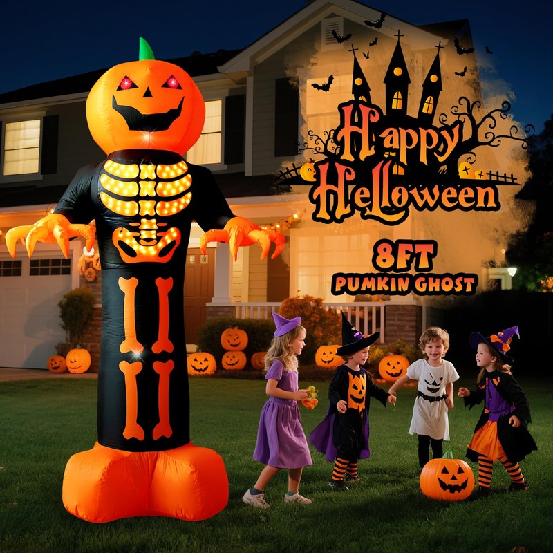 HFO 8 FT Halloween Inflatables Outdoor Decoration Pumpkin Reaper Ghost with Magic Lightshow Bones and Flashing Eyes Blow Up Yard Decoration with LED Lights Holiday Party Yard Lawn Decor